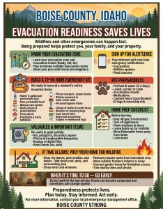 Boise County residents are encouraged to know their designated evacuation zone and register for Alertsense to receive critical emergency updates. Please familiarize yourself with all exit routes from your property. Note that Boise County has limited cellular coverage, and power outages may disable internet service. Please ensure your household is prepared.